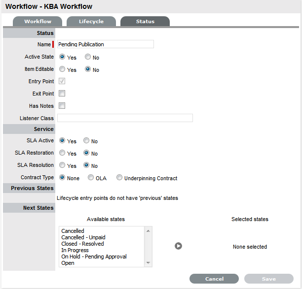 For this example, the State will be labeled KBA Assessment and the KBA Approval option is set to Yes. This will remove the Next State option and replace it with the Accept State and Reject State drop-down list. For this example, set Pending Publication as the Previous State, Cancelled as the Accept State and Closed-Resolved as the Reject State.
