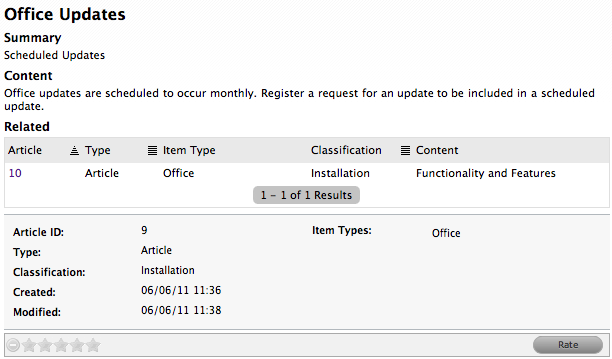 To this end, the system includes the Knowledge Base as an integral part of the Configuration Management System, using the Classifications, Categories and Types of the CMDB as the filing system for all Knowledge Base Articles. Therefore, when new requests are logged with the Service Desk, the system automatically searches through its information store for any Articles related to the current issue.