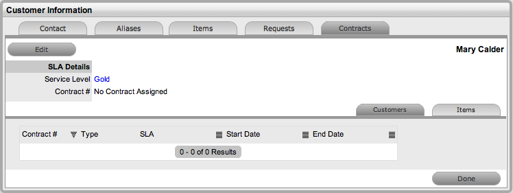 The Contracts tab displays a Customer's current contract status. A Customer can be assigned an SLA or, when Billing is enabled, a Contract. A Customer can only have one active Contract, but contracts can be queued within the Contract >Customer tab, as required.