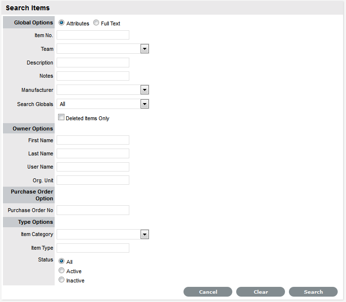 A search page is displayed with the options to search across the Team, Item Status, Manufacturers, Global Items, Item Ownership, Item Categories and Types. There is also the option for the search results to return deleted Item information.