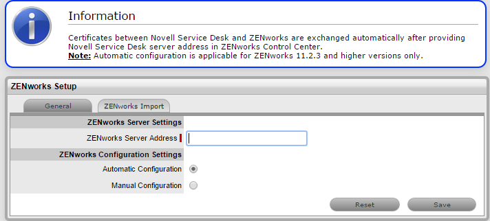 NOTE:Automatic Configuration is applicable for ZENworks 11.2.3 and higher versions only. For earlier versions of ZENworks, use the Manual Configuration option.