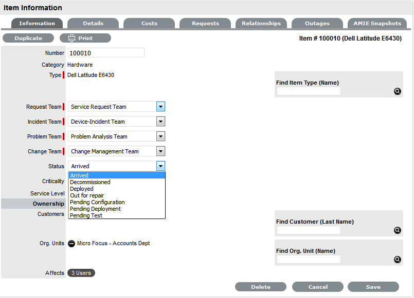 An Outage is when an Item Status is unavailable due to expected or unexpected events. For example, the Item may be out for repair or faulty. To move an Item into an unavailable State, and therefore list it as inactive, the Item Status selected for the Active State option within the Item Category Lifecycle must be set to No, and the Offline State option set to Yes.