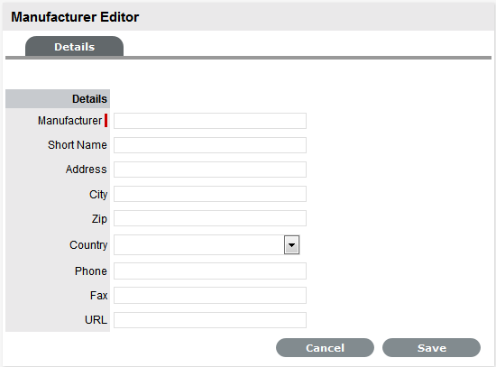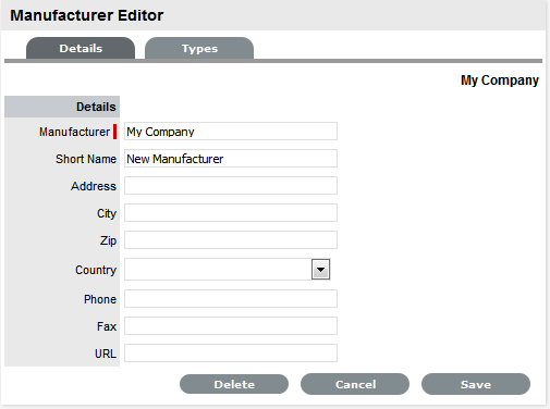 The details of suppliers who manufacture goods used within the organization can be configured within the Manufacturers tab. The list of Manufacturers configured here form the drop-down list options within the Type Information screen.