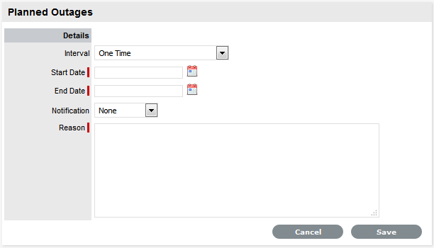 If an Item has an SLA with a specified Blackout Period, ideally Outages should be planned to fall within this time. The Blackout Period is an agreement between the Customer and the service provider regarding a period of time when the Customer has no service expectations. This can also be the preferred time for Item upgrades and maintenance without affecting service availability. To access the Blackout Period details for an SLA associated with an Item, create the Planned Outage within the Outages tab of the Item Information screen.
