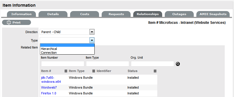 Items with Item relationships that have been imported using the AMIE engine, retain the relationships that exist within the Asset Management Tool. A visible map of the relationships is recorded within the Relationships tab.