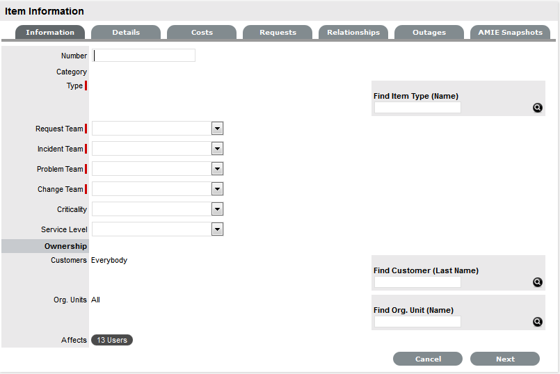 NOTE:If Billing is enabled an owner must be assigned to the Item. The owner can be either a Customer or an Org Unit, but only Org Units that have a Primary Contact, will be displayed in the Org Unit Search list. (See: Primary Contact.)