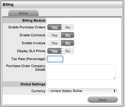NOTE:Invoices and Contracts will not work when Global Items are in use. If Billing is enabled after the application has been in use, a Supervisor will need to assign owners to Global Items before Billing can be activated.