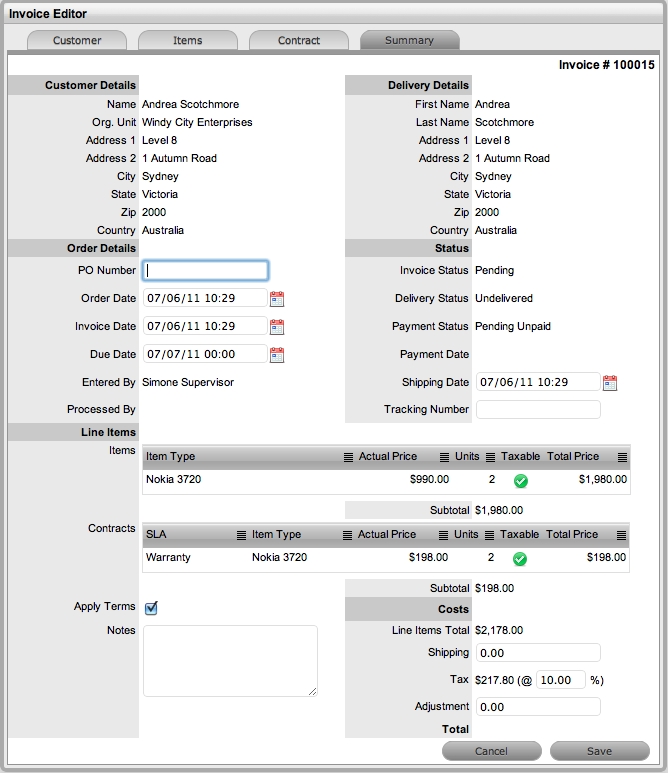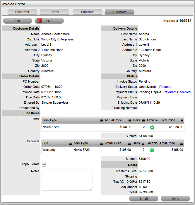 The Invoices section allows Customers to be billed for products (Items) or support services (Contracts) provided by the organization. An Invoice can be created when an Item and Service Contract is ordered by a Customer. Alternatively, Invoices can be created for Service Contracts alone, as the Item may already exist in the system.