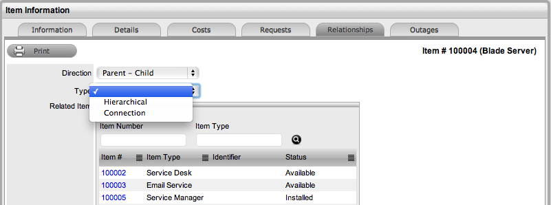 Items with Item relationships that have been imported using the AMIE engine, retain the relationships that exist within the Asset Management Tool. A visible map of the relationships is recorded within the Relationships tab.