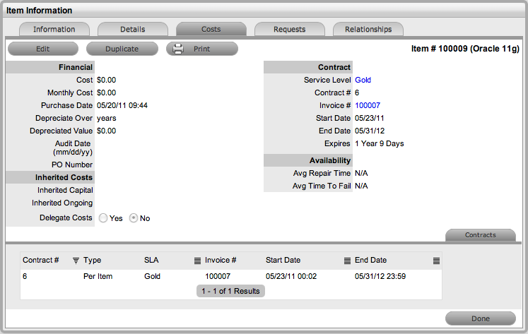 For Users who are not assigned the Finance Role, the Costs Tab displays SLA Details and Item Availability information. Users who are assigned the Finance Role, also have access to the Item's financial and contractual details. The following Item Costs details include: