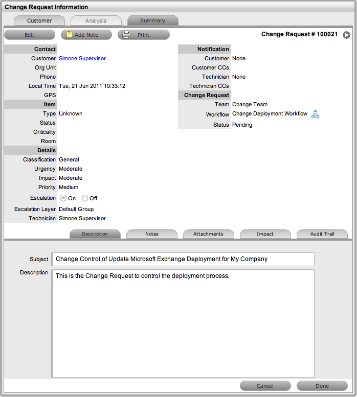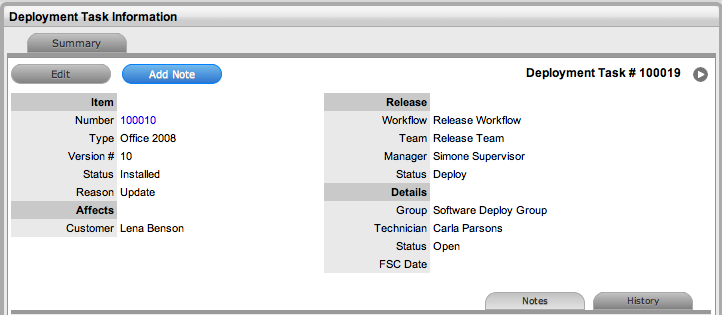 Within the Change > Deployment Tasks tab, Technicians can edit Deployment Tasks by adding Notes using the New Note button, which are stored in the Notes tab, or update the Status of the Task to Closed-Resolved. When all Deployment Tasks are completed, the Deployment is automatically closed by the system. When all Deployments are closed for a Release, the Release Manager can close the Release within the Details tab, by moving the Release Workflow Status to the Exit State.