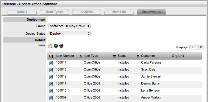 For this example, per Customer Deployments will be created as all Items associated with the Release are owned directly by Customers. The list of Customers can be sorted into Org. Unit groups by clicking the toggle in the Org. Unit Column Header.