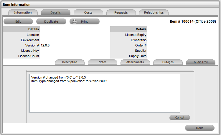 For customers with Office 2008, based on the system configuration within the CMDB Item Type of Office 2008, we will just be updating the software version number in the Item Details tab.