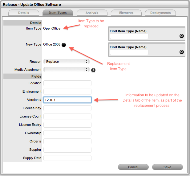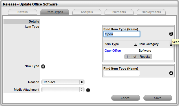To associate the Items that are to be created or updated as part of the Release, the Release Manager has to define the reason for the Release and assign the relevant Item Type to the Release. This is achieved within the Item Types tab of the Release. For our example, there will be three reasons for the Release:- Upgrade existing software, replacing existing software and installing new software.