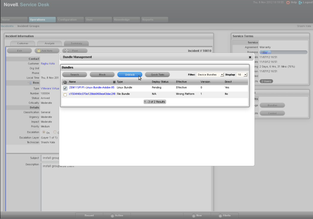 The status of the unblock operation is displayed in the Bundle Management window.