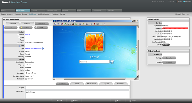 Novell Service Desk allows you to remotely manage a device on the Service Desk Web console by using the ZENworks Control Center Remote Management capability. You can do the following: