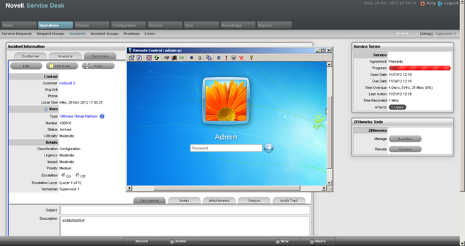 5. If you get an error message, verify that the time between ZENworks Configuration Management Primary Servers and the Novell Service Desk Server is within 1 minute of each other. Then verify that your technician has the correct roles and privileges in ZENworks Control Center.
