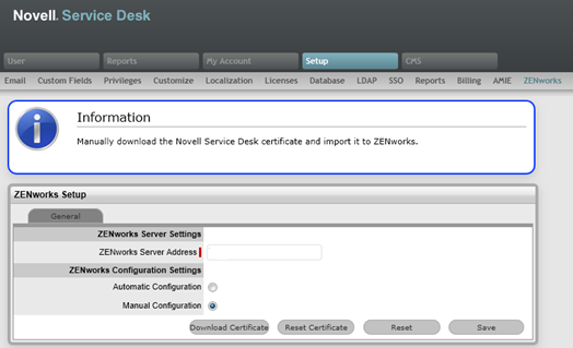3. Provide Novell Service Desk server address in the ZENworks Control Center for automatic exchange of certificates.