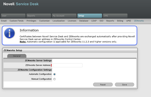 1. In the Novell Service Desk user interface, click Setup > ZENworks.