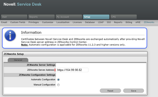 In the Novell Service Desk user interface, click Setup > ZENworks.