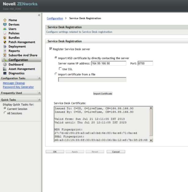 Provide Novell Service Desk Server address in the ZENworks Control Center for automatic exchange of certificates.