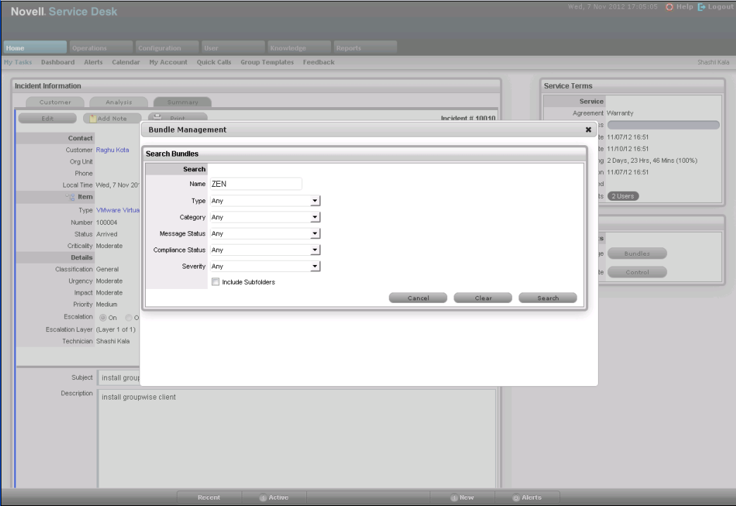 You can use the Novell Service Desk user interface to search for a bundle that has been assigned to the device for which the service request has been entered or the customer who has entered the service request.