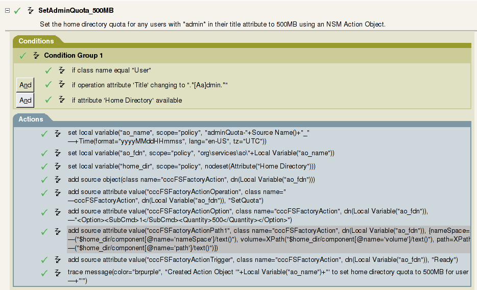 <comment xml:space="preserve">Set the home directory quota for any users with *admin* in their title attribute to 500MB using an NSM Action Object.</comment>