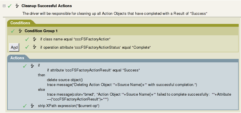 The Cleanup Action Objects policy is a helper policy that allows Novell Identity Manager to delete any Action Objects that have successfully completed. In addition, it adds trace messages to indicate success of the Action Object cleanup, or displays the error message from the Action Object’s operation if the Set Quota operation failed.