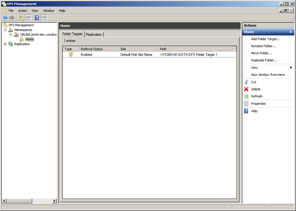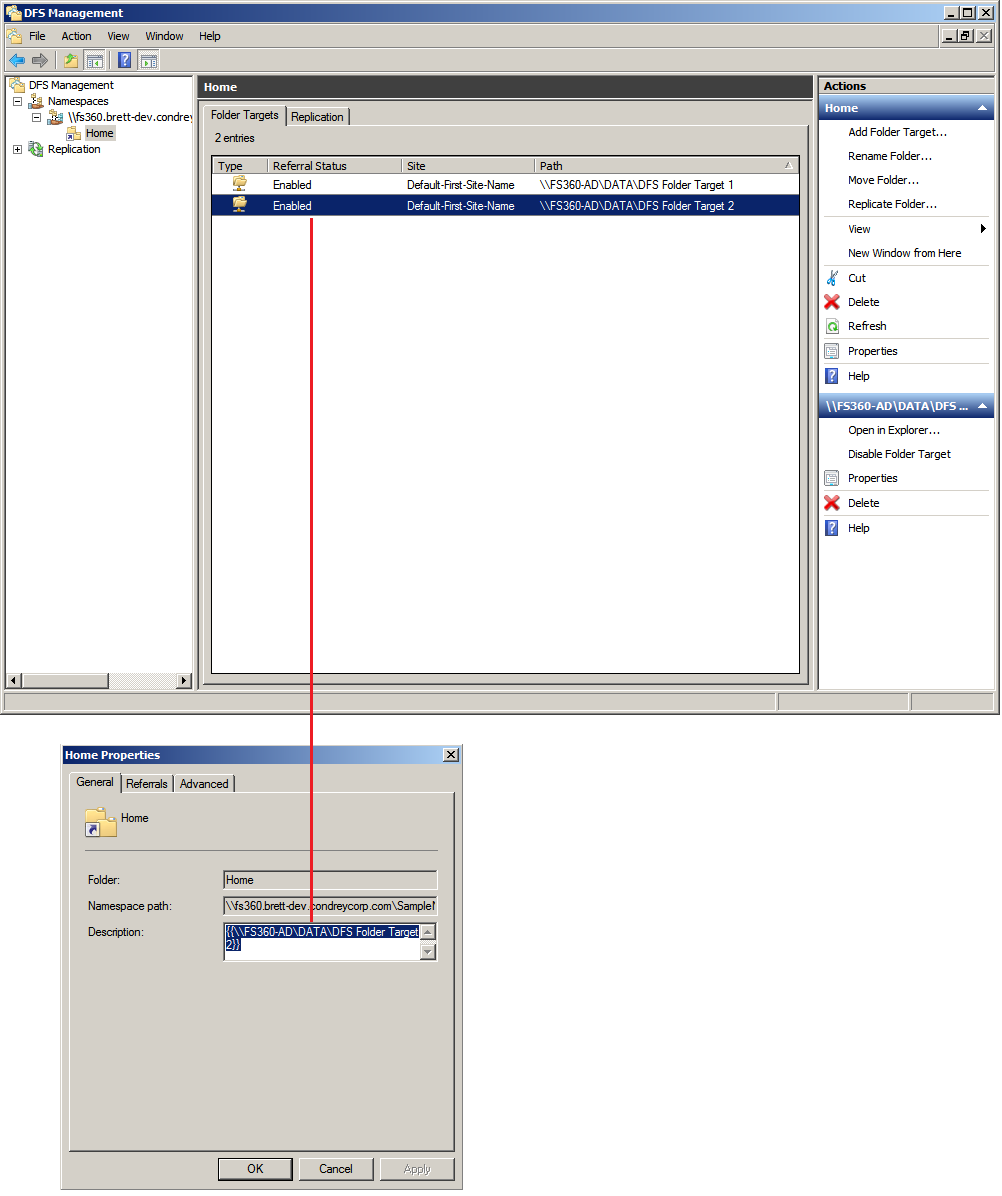 The Home Properties dialog box is accessed by double-clicking the listing in the DFS Management console.