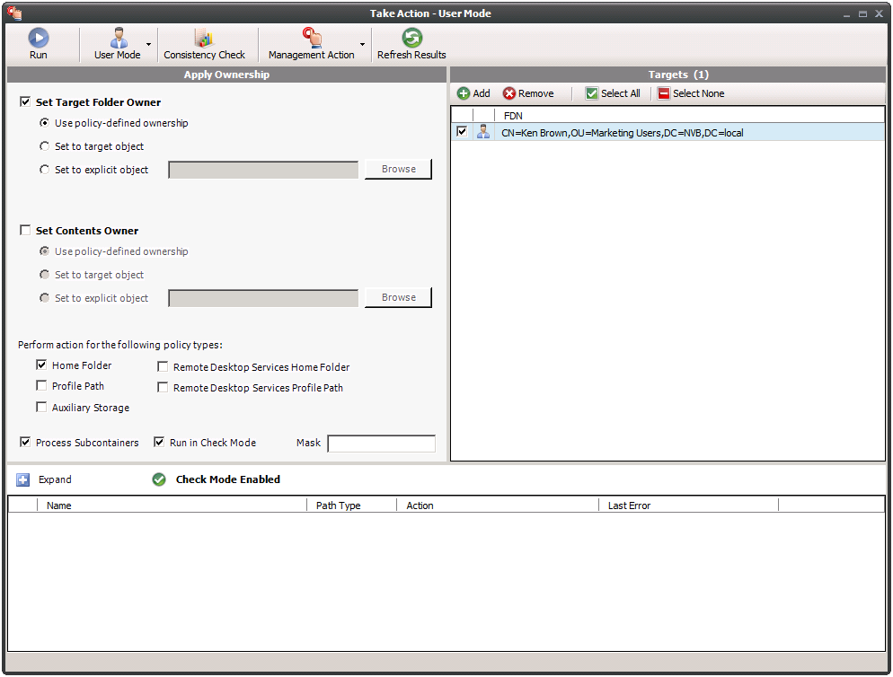 NOTE:The ownership specifications you make on the page shown above are applied to folders and files that exist at the time the Management Action takes place. The ownership of files and folders that are created later is not affected by this action. For example, if a user's home folder is moved due to an Enforce Policy Path action, the ownership of the user’s home folder will be determined by the settings in the policy.