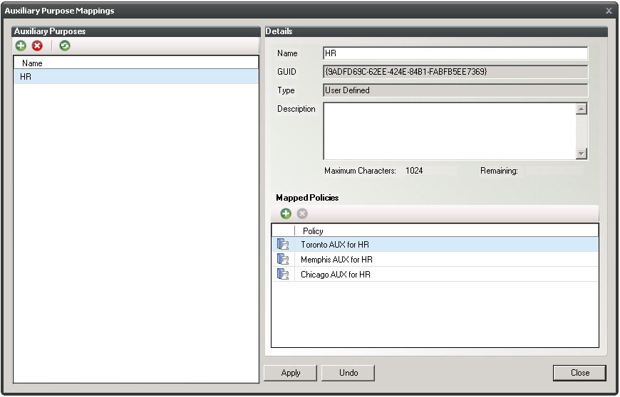 Auxiliary Policy Mappings: Auxiliary policy mappings give you the ability to specify a purpose or classification for auxiliary storage policies. For example, you might want to create an HR purpose for all of the auxiliary storage policies that create HR folders for employees. With each of the auxiliary storage policies that create HR folder assigned the same purpose, it makes it possible for Novell Storage Manager to make intelligent decisions for auxiliary storage when a user is moved.