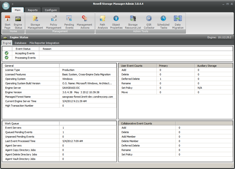 The Engine Status page provides an overview of the current status of the NSM Engine through the tab. If you are not seeing Novell Storage Manager enact actions after events in Active Directory take place, viewing whether the NSM Engine is processing and accepting events through this page is a good first step in troubleshooting.