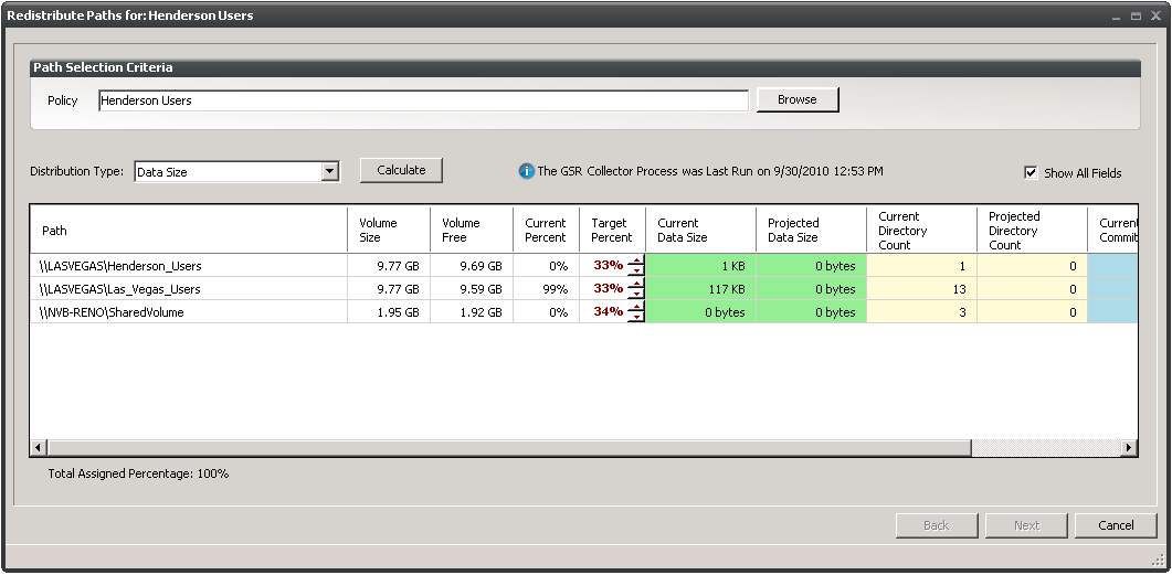 Using the Redistribute Policy Paths dialog box, you can redistribute the user and collaborative storage across the target paths associated with a policy.