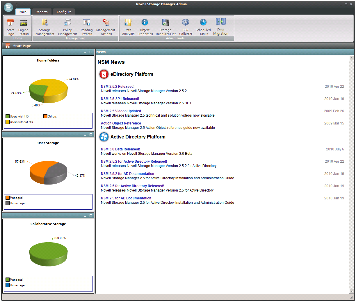 The left panes of the Start Page tool display an at-a-glance view of the management status of user storage, collaborative storage, and users and groups that have home folders. The right pane displays links to resources and product news.