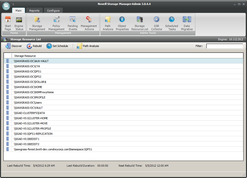 Rebuild: Clicking this button initiates a search within the entire forest domain for all available shares or DFS namespaces. When you create or edit a policy, you might need to rebuild the list if the share or DFS namespace you need does not appear in the storage resource list. Depending on the size, configuration, and topology of your network, this can take a significant amount of time.