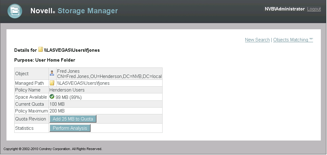 Add or remove a quota or perform a storage analysis by using the buttons provided.