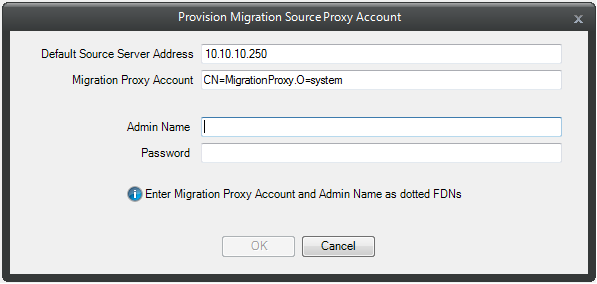 Migration Proxy Account: Provision a migration proxy account by specifying the typeless fully distinguished name (FDN) of the proxy account that you want to provision.