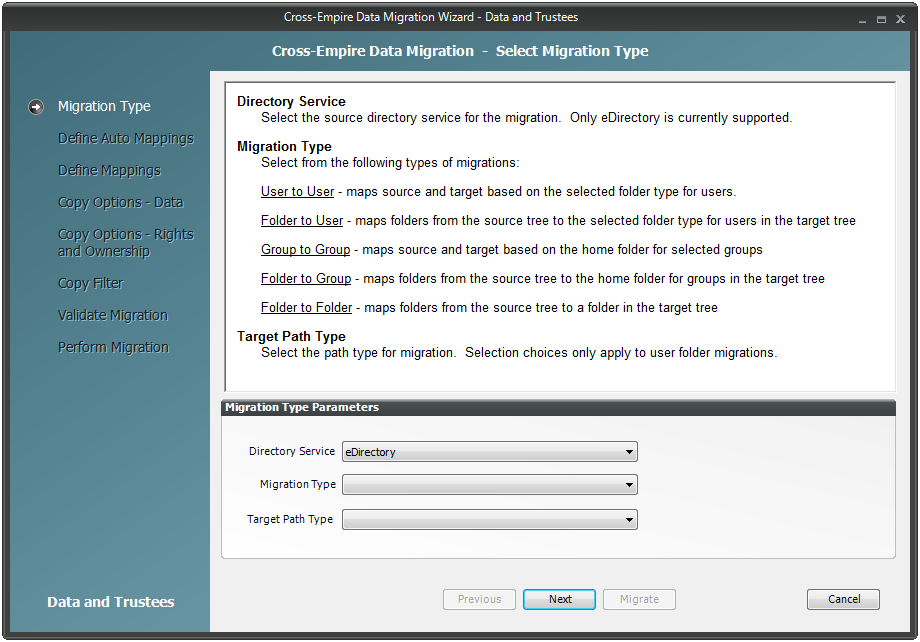 From the drop-down menu, select the target path type for the data that you will migrate.