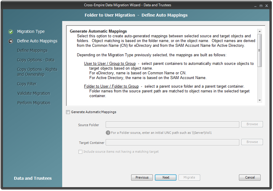 Generate Automatic Mappings: If you are migrating a large number of folders, select this check box to activate the other fields.