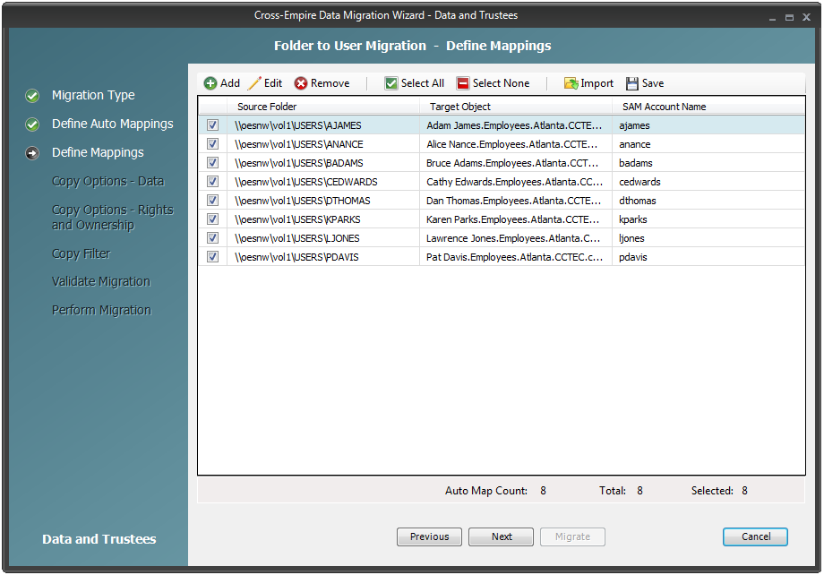 The Data Migration Wizard attempts to match the names of the subfolders of the source path with the SAM (Security Accounts Manager) Account Names in the Active Directory target. If there is a match, the listed folder in the field is selected and a corresponding match is listed in the Target Object column.