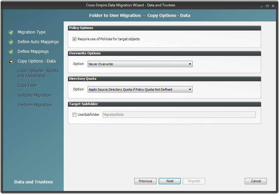 Require use of Policies for target objects: If you are migrating data for objects to an Active Directory container that has an associated Novell Storage Manager policy, leave this check box selected.