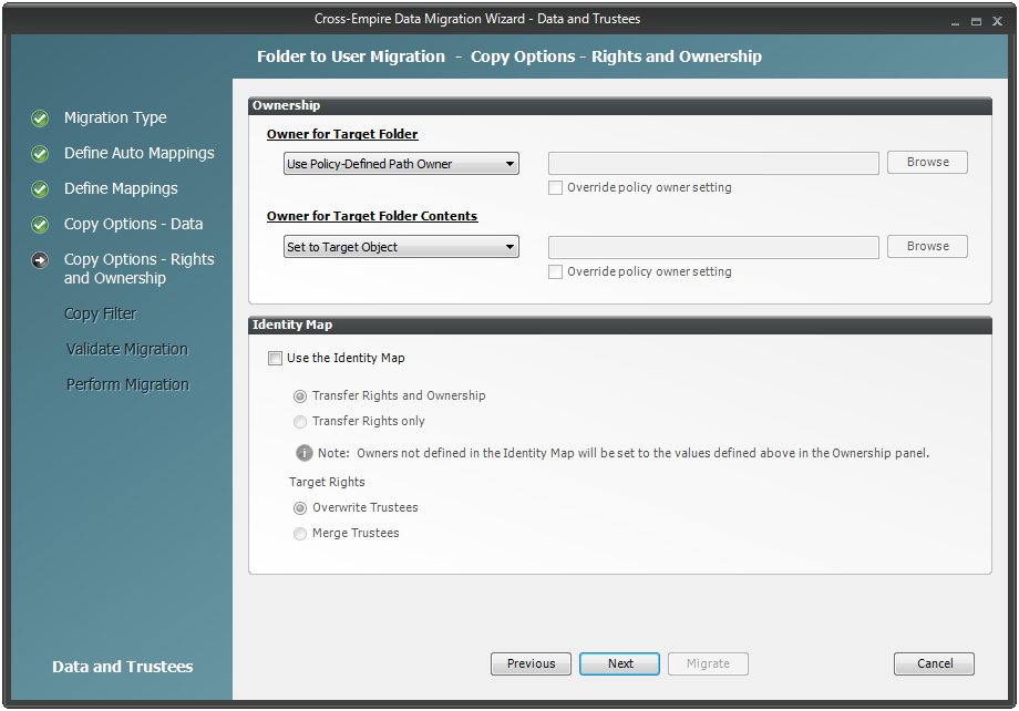 Overwrite Trustees: Selecting this option indicates that you want any existing trustee assignments for a target file or folder, to be overridden by the established Novell eDirectory trustee assignments for those files and folders.