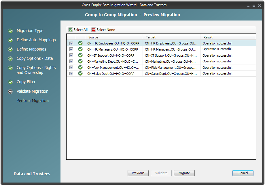 The Data Migration Wizard attempts to match the Common Names (CN) of objects from the eDirectory source with the SAM (Security Accounts Manager) Account Names in the Active Directory target. If there is a match, the listed object in the field is selected and a corresponding match is listed in the Target Object column.