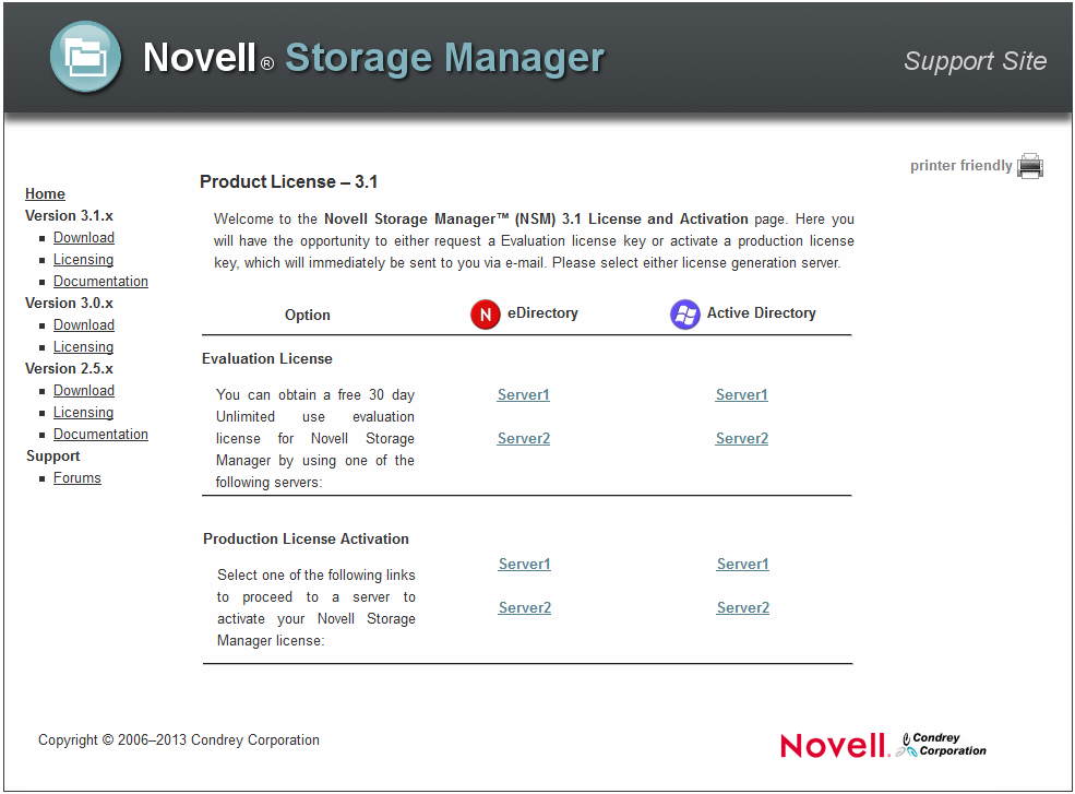 After you purchase Novell Storage Manager, activate your production license by clicking one of the server links in the region.