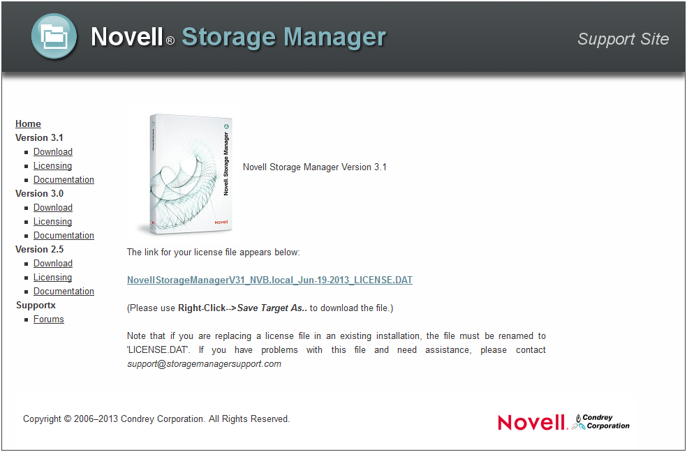 Novell Storage Manager requires a production license file, evaluation license file, or assessment license file that you obtain from Novell.