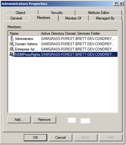 Every server that has storage managed by Novell Storage Manager must have certain privileges granted to the NSMProxyRights group. If you install the NSM Agent on a server, this privilege assignment is made automatically. If you use the NSM Agent on one server to act as a proxy agent on another server—rather than installing an NSM Agent on that server—you need to manually assign these privileges on that server.