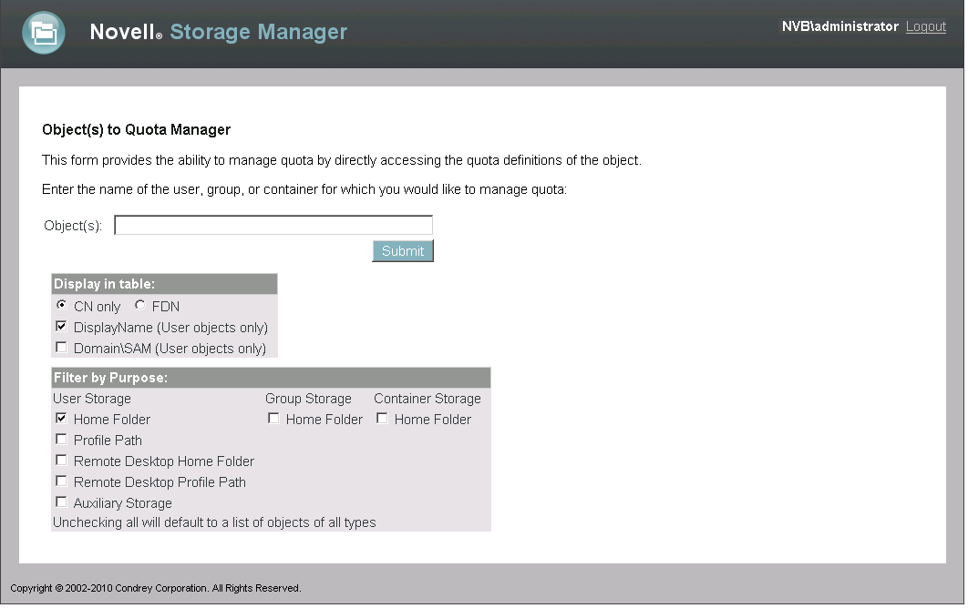 If a user is enabled as a quota manager through eDirectory rights rather than through designation in the policy, the user must log in using a fully distinguished name.