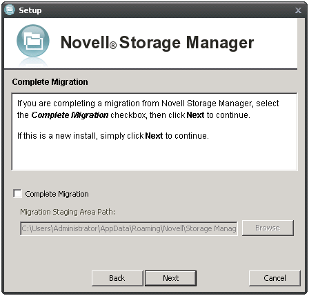 Because this is a new installation and not a migration from an earlier version of Novell Storage Manager, click .