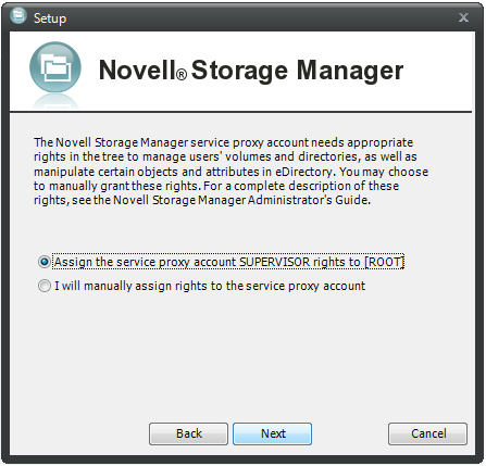 Assign the NSMProxy account Supervisor rights to the root of the directory tree by accepting the default option.