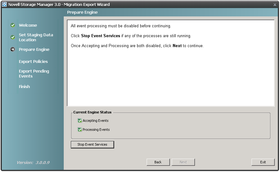 This stops the Novell Storage Manager 2.5x NSM Engine from accepting and processing events.